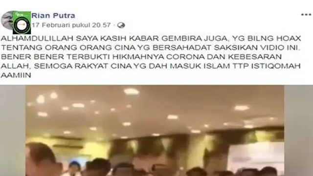 - Akun Facebook Rian Putra mengklaim hikmah Virus Corona (Covid-19) membuat orang-orang China bersyahadat masuk Islam. klaim tesebut diunggah, pada 17 Februari 2020, dengan keterangan sebagai berikut: